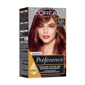 Стойкая краска для волос L'Oreal Paris Preference 5.23 Темное розовое золото Светло-каштановый розово-перламутровый, 174 мл Потрясающий блеск, шелковистость и насыщенный оттенок окрашенных волос с краской всемирно известного бренда L’Oreal Paris. Средство содержит ухаживающие компоненты, которые продлевают результат окрашивания и укрепляют волосы после процедуры. На 100% закрашивает седину.